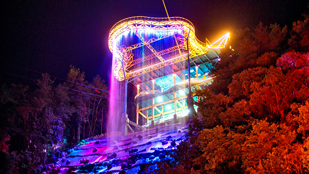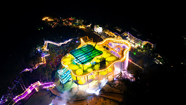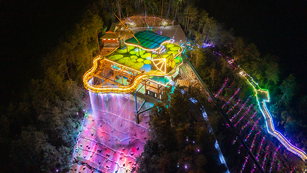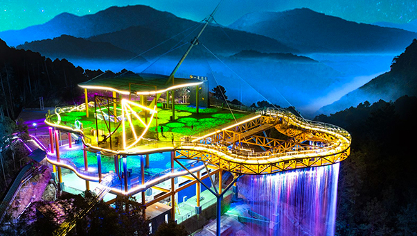 云綜水晶塔總投資 2000 萬元,一層面積 530m2,二層面積 1164m2,三層面積1320m2,總面積約 3000m2,垂直高度約 108m(近 33 層樓高),建在險峻的山體上,共由 21 根巨型鋼柱懸空支撐。獨特的“云”形空中廊橋由平臺向外伸出近 35 米,望去宛如一朵超大的“云”漂浮在高山之上。