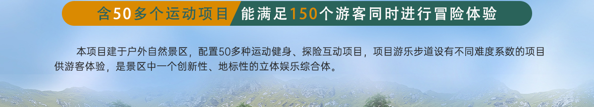 本項(xiàng)目建于戶外自然景區(qū),配置50多種運(yùn)動(dòng)健身、探險(xiǎn)互動(dòng)項(xiàng)目,項(xiàng)目游樂(lè)步道設(shè)有不同難度系數(shù)的項(xiàng)目供游客體驗(yàn),是景區(qū)中一個(gè)創(chuàng)新性、地標(biāo)性的立體娛樂(lè)綜合體。