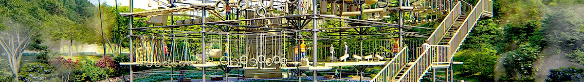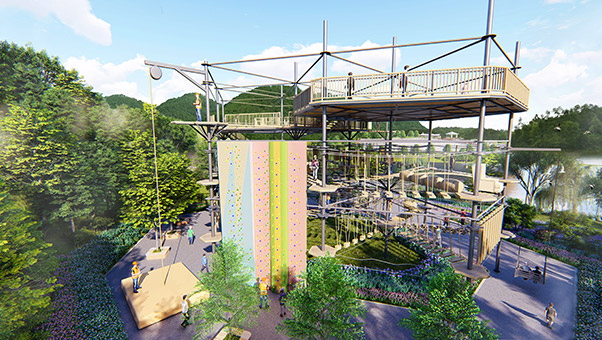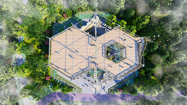 本項目建于戶外自然景區(qū)(亦可在室內(nèi)搭建),配置上百種運(yùn)動健身、探險互動項目,項目游樂步道設(shè)有不同難度系數(shù)的項目供游客體驗,是景區(qū)中一個創(chuàng)新性、地標(biāo)性的立體娛樂綜合體。該設(shè)備占地面積達(dá)到500m2,綜合用地面積達(dá)600m2,單層高達(dá)4m,內(nèi)部以晶體結(jié)構(gòu)搭建架空層1-4個步道層級,打造層超過600m長的空中游樂路線。