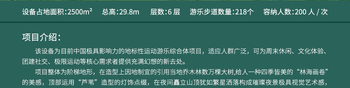 該設(shè)備為目前中國極具影響力的地標(biāo)性運(yùn)動(dòng)游樂綜合體項(xiàng)目,適應(yīng)人群廣泛,可為周末休閑、文化體驗(yàn)、團(tuán)建社交、極限運(yùn)動(dòng)等核心需求者提供充滿幻想的新去處。
