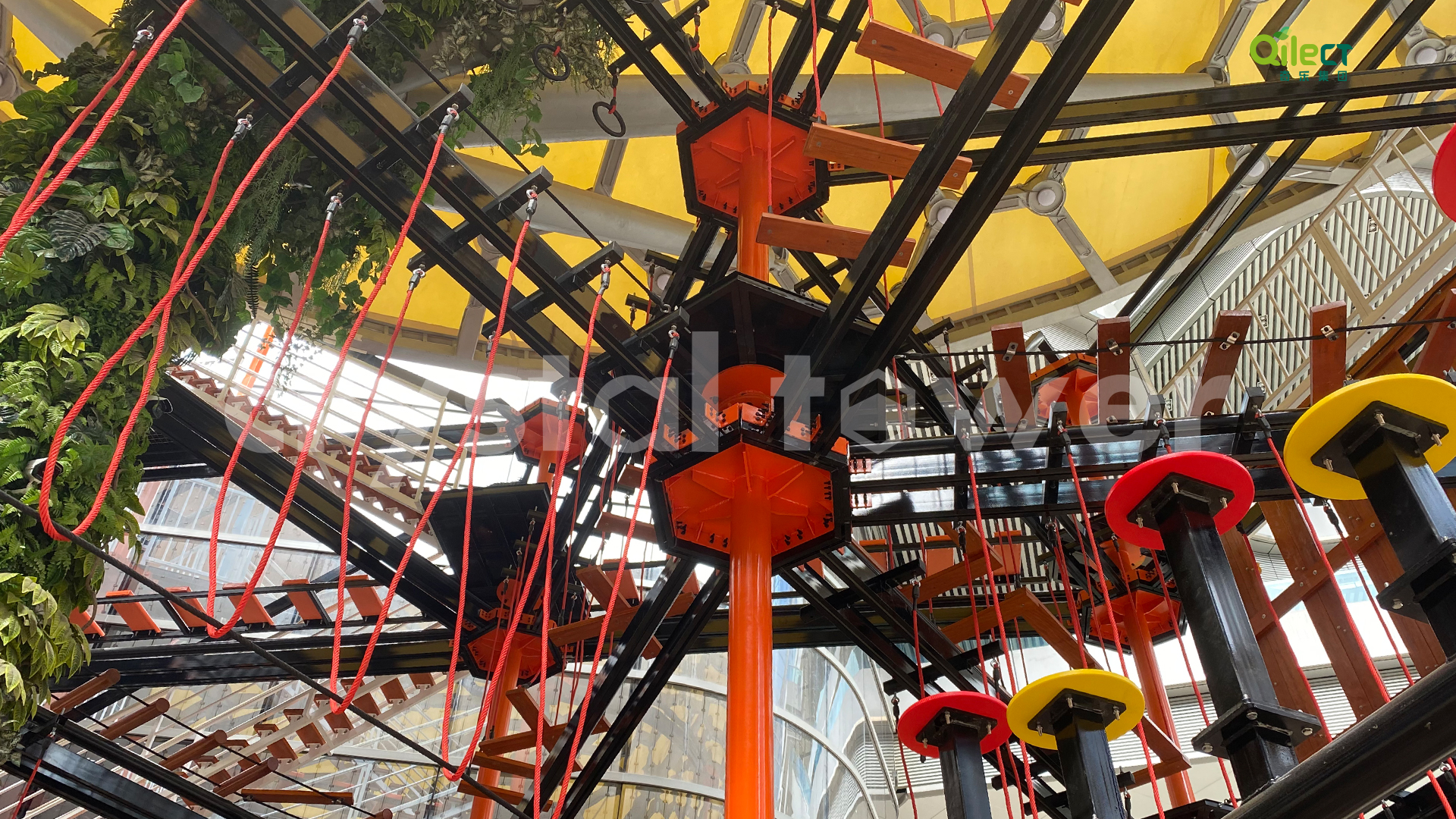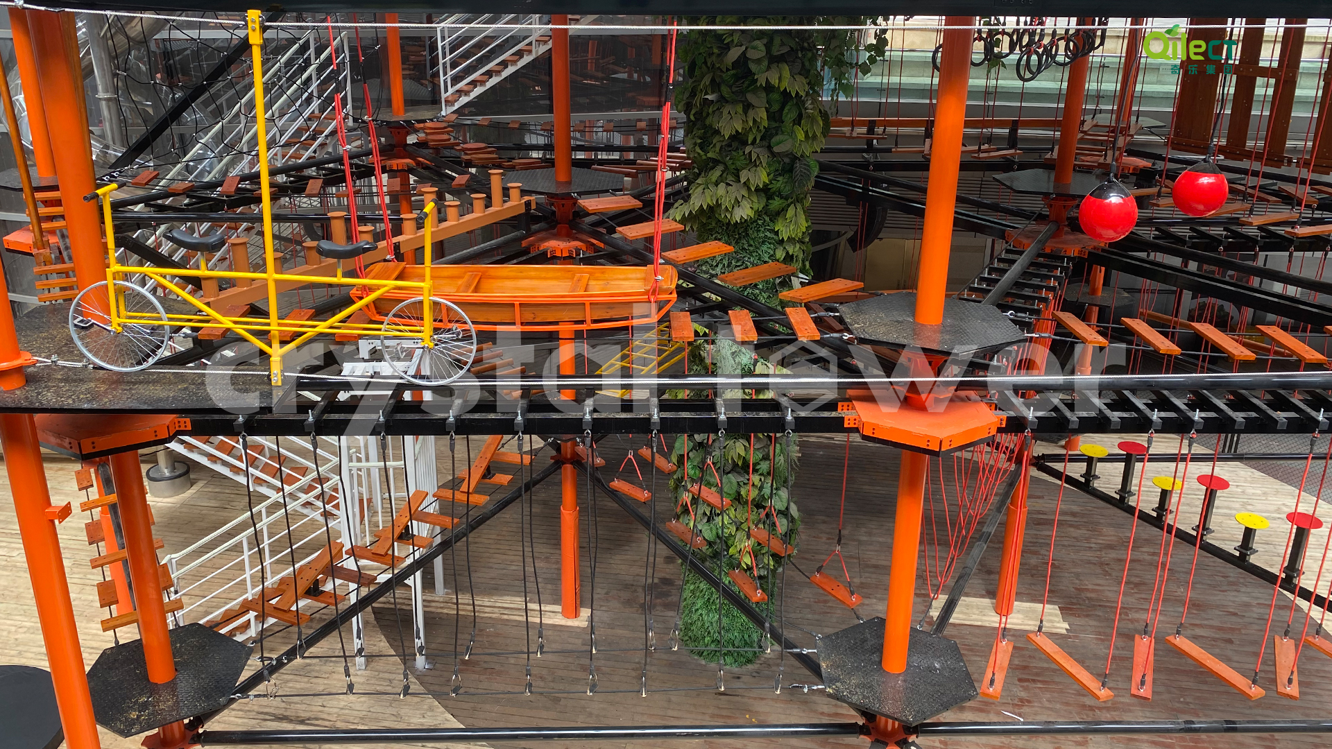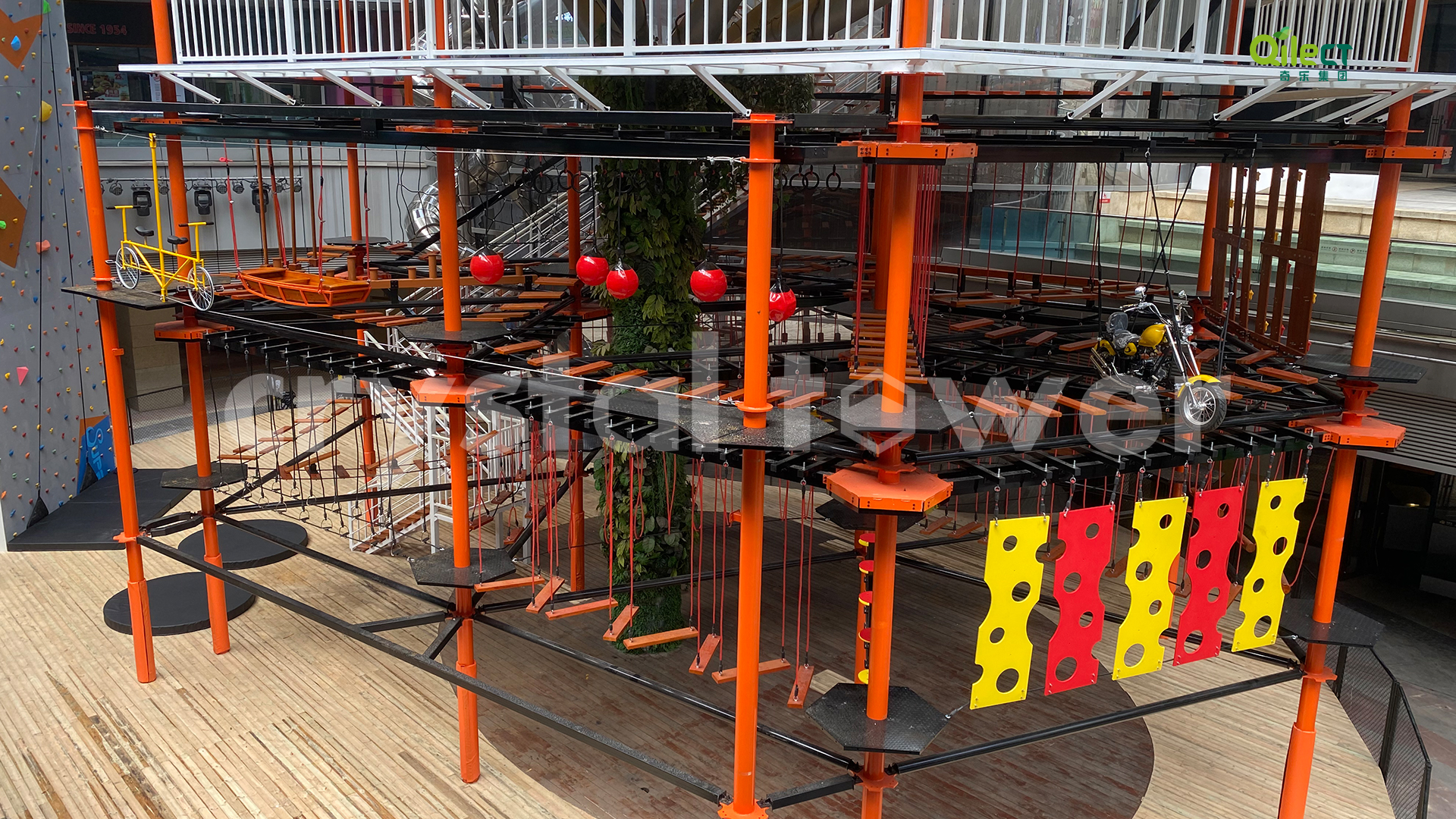 設(shè)備占地面積達(dá)到 180m2,綜合用地面積達(dá) 240m2,單層高達(dá) 3m,總高達(dá) 14m,內(nèi)部以晶體結(jié)構(gòu)搭建架空層 1-3 個步道層級,打造超過380m 長的空中游樂路線,其中包含 66 個運動項目(包含尖叫滑梯、低空蹦極、溜索),能滿足 70 個游客同時進(jìn)行冒險體驗。