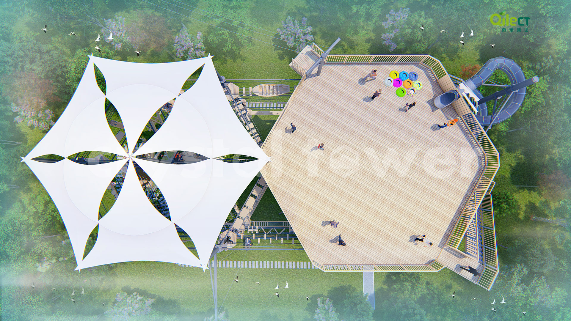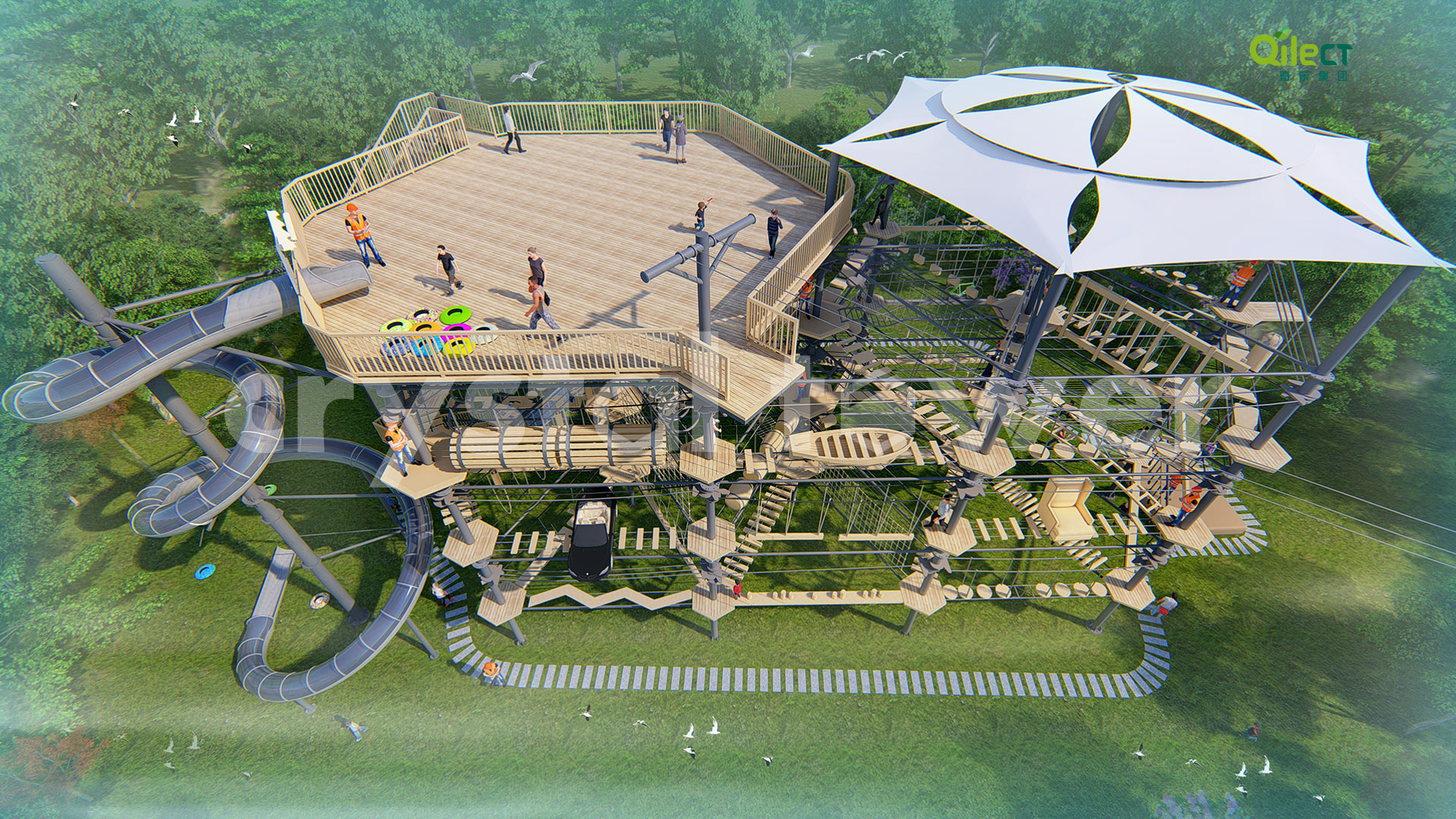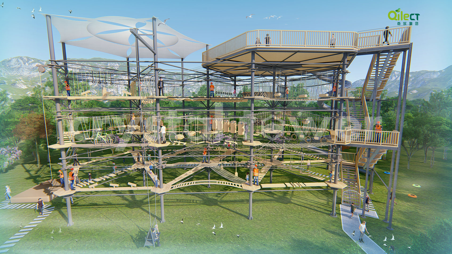本項(xiàng)目建于戶(hù)外自然景區(qū)(亦可在室內(nèi)搭建),配置上百種運(yùn)動(dòng)健身、探險(xiǎn)互動(dòng)項(xiàng)目,項(xiàng)目游樂(lè)步道設(shè)有不同難度系數(shù)的項(xiàng)目供游客體驗(yàn),是景區(qū)中一個(gè)創(chuàng)新性、地標(biāo)性的立體娛樂(lè)綜合體。該設(shè)備占地面積達(dá)到800㎡,綜合用地面積達(dá)1000㎡,單層高達(dá)4m,內(nèi)部以晶體結(jié)構(gòu)搭建架空層1-4個(gè)步道層級(jí),打造層超過(guò)1m長(zhǎng)的空中游樂(lè)路線。