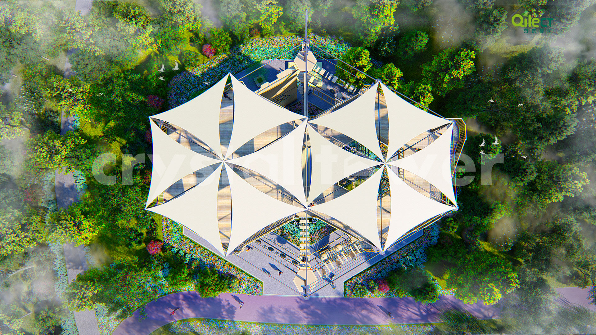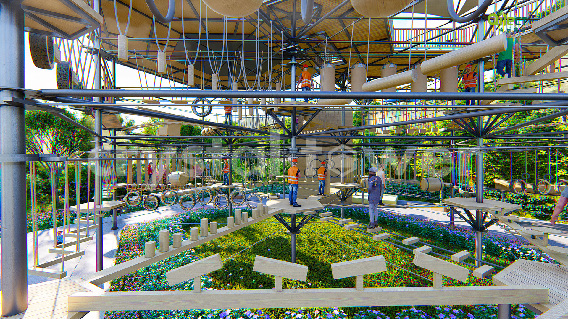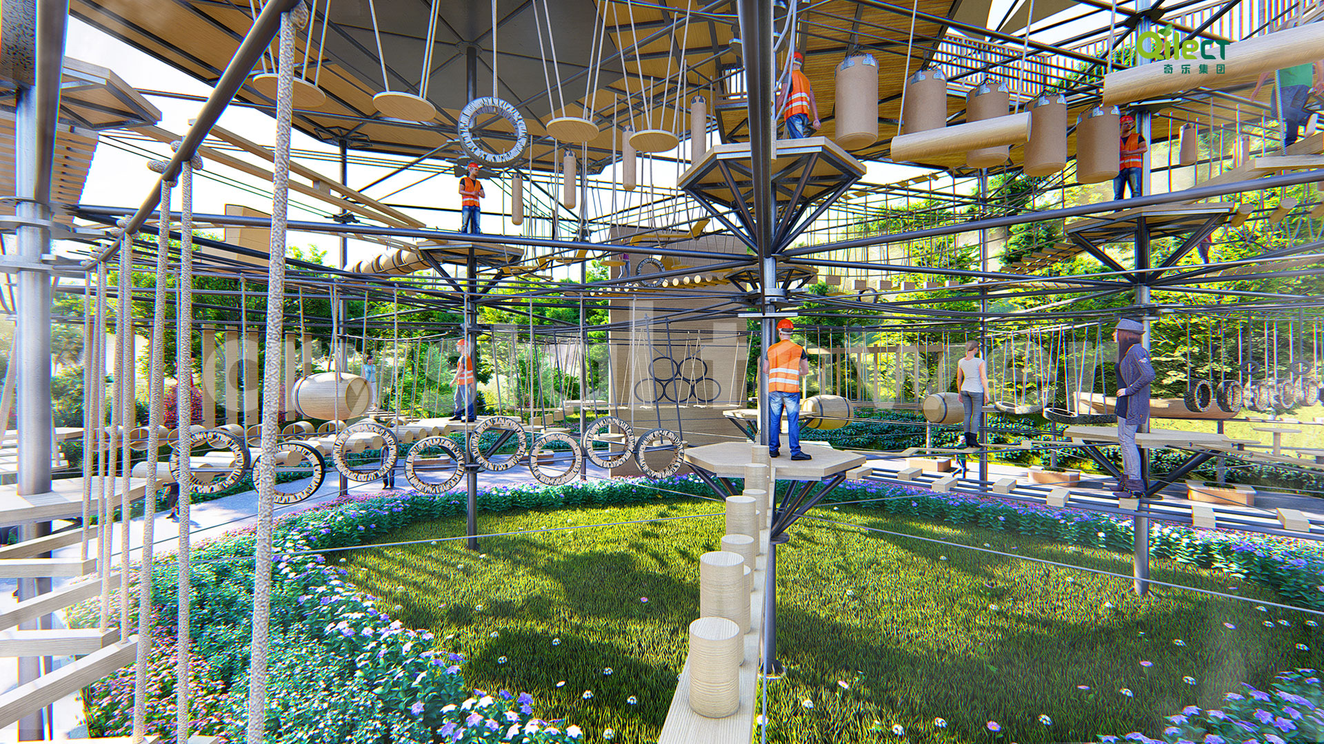 本項目建于戶外自然景區(qū)(亦可在室內(nèi)搭建),配置上百種運動健身、探險互動項目,項目游樂步道設有不同難度系數(shù)的項目供游客體驗,是景區(qū)中一個創(chuàng)新性、地標性的立體娛樂綜合體。該設備占地面積達到500m2,綜合用地面積達600m2,單層高達4m,內(nèi)部以晶體結構搭建架空層1-4個步道層級,打造層超過600m長的空中游樂路線。